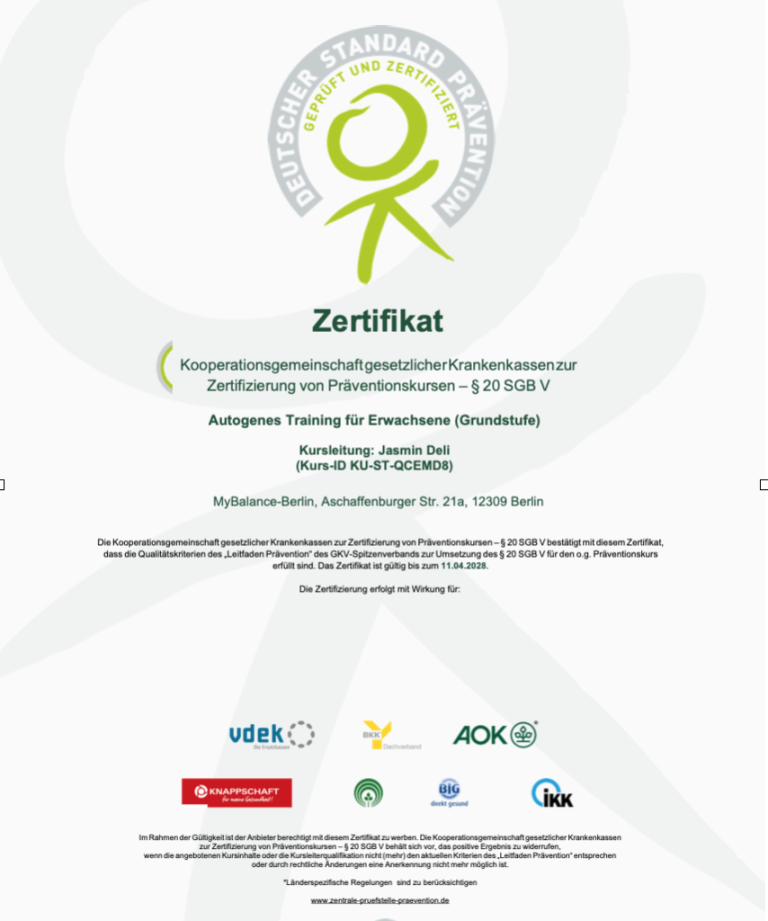 Die Gesundheitskurse sind von der Zentralen Prüfstelle Prävention nach § 20 SGB V zertifiziert, das bedeutet, sie erfüllen die hohen Qualitätsstandards der gesetzlichen Krankenkassen,